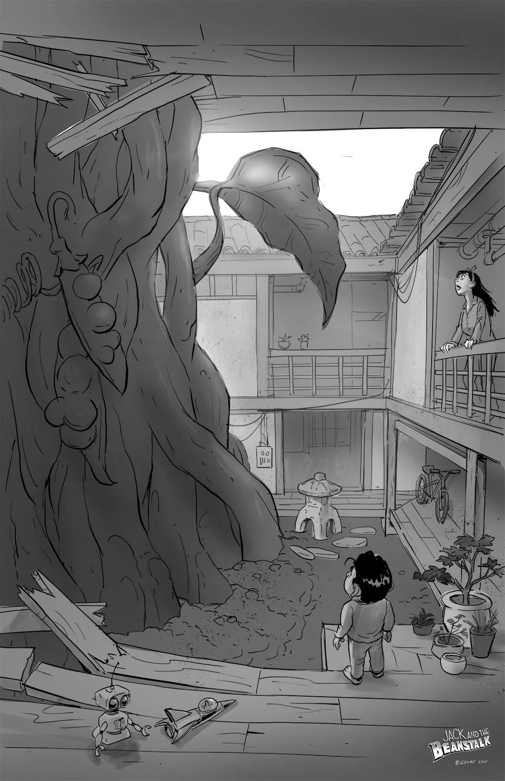 Combines the classic fairy tale with a “mid-century sci-fi” style and sets it in Japan. In my version of the tale, Jack’s beans fall on radioactive soil, where a mutated beanstalk grows up to the heavens. A Giant alien mercenary, having just bought a Golden Guitar sonic weapon from the biggest weapons dealer, the USA, is flying east to start a war with China and frame the US, but crashes into the beanstalk in Japan. Jack, being closest, is tasked with retrieving the weapon for the US. After the Giant is vanquished, the US wants their Golden Guitar weapon back, but noble Jack destroys it, throwing it into a volcano, so no one can have it.